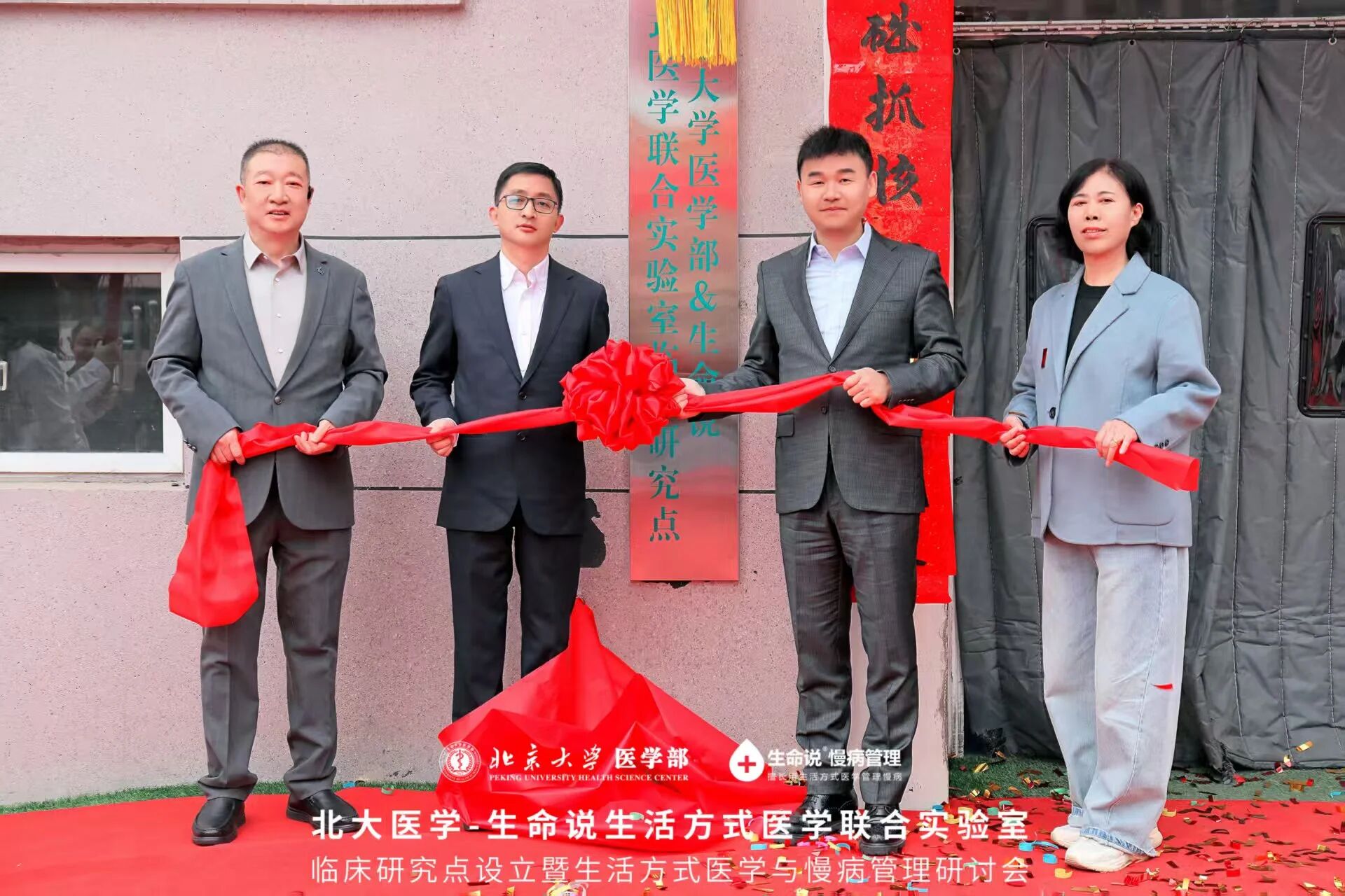 在与会嘉宾的共同见证下,揭牌仪式将活动推向高潮。北大医学-生命说生活方式医学联合实验室主任马德福、副主任梁志与临汾市尧都区路东第二社区卫生服务中心主任李青海共同为临床研究点揭牌,标志着这一合作项目正式启动。