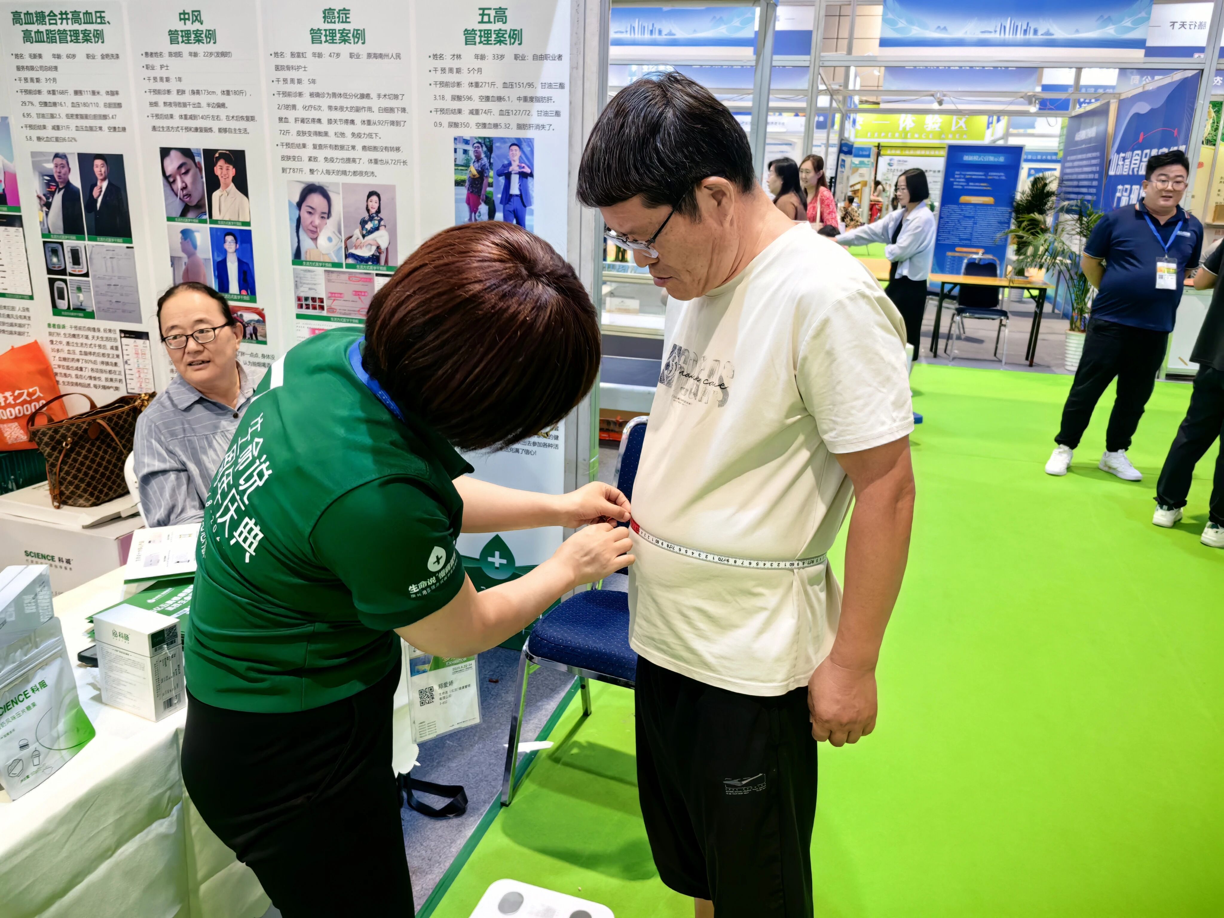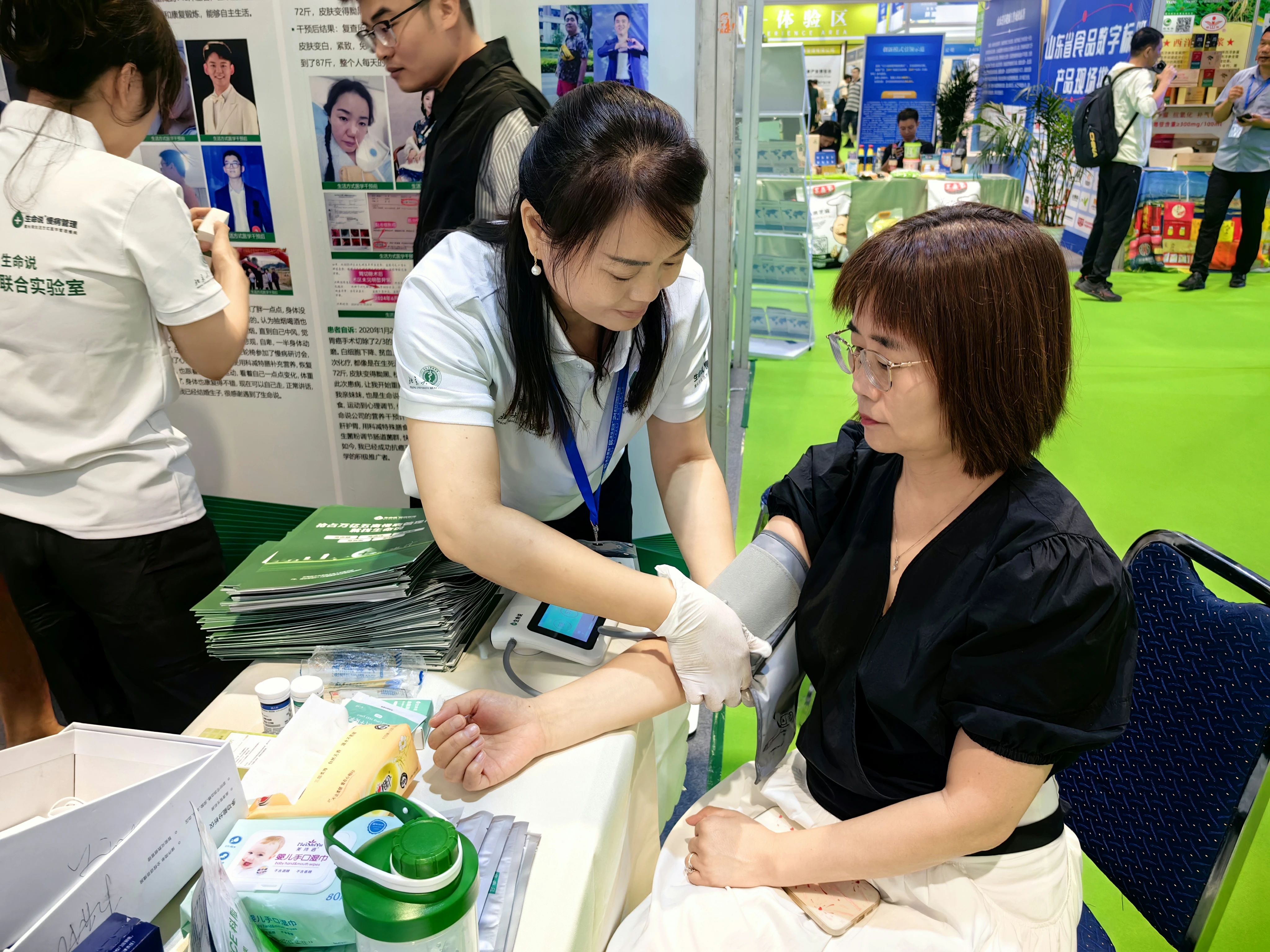 此次展会,生命说在企业主展区与产品体验区分别设立展位,十余位优秀的健康管理师兵分两路,为慕名而来的参会者提供全方位健康服务:从慢病管理知识答疑、个性化健康建议输出,到免费健康检测(包括血压测量、体脂率分析、腰腹围测量等代谢综合征关键指标检测),再到科学健康科普资料发放,每一个环节都力求专业、细致、实用。